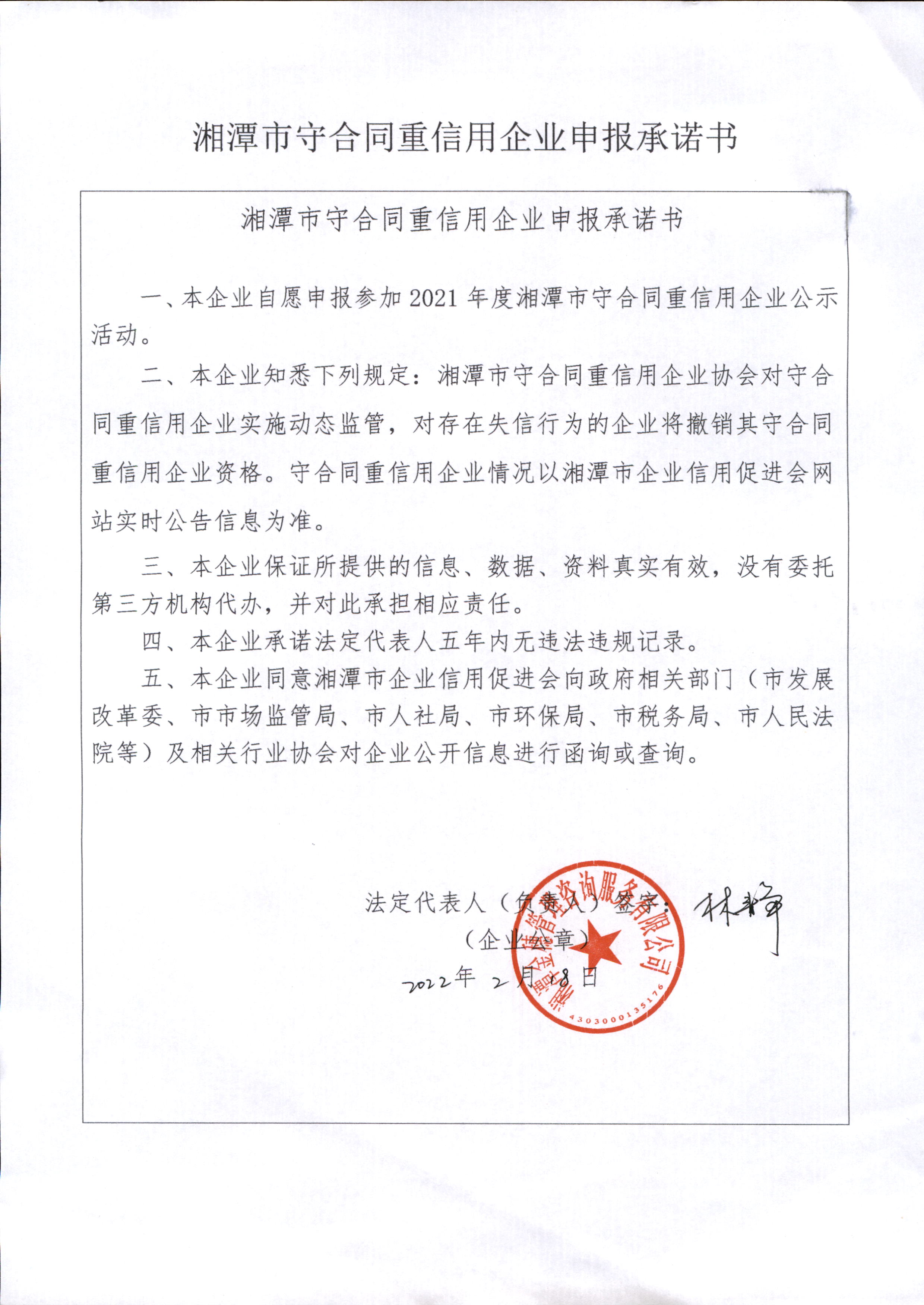 本企業(yè)根據(jù)《湘潭市守合同重信用企業(yè)申報規(guī)定》等編制 2021 年度企業(yè)信用報告書,并保證本報告書內(nèi)容真實、準(zhǔn)確、完整。