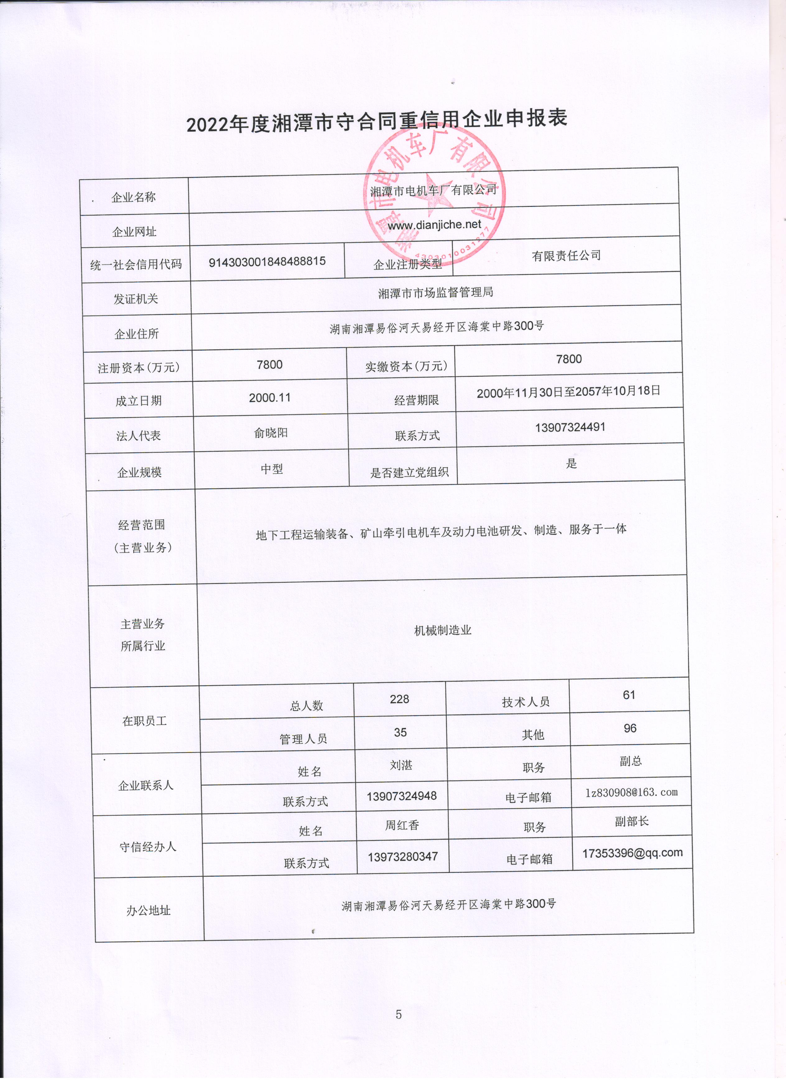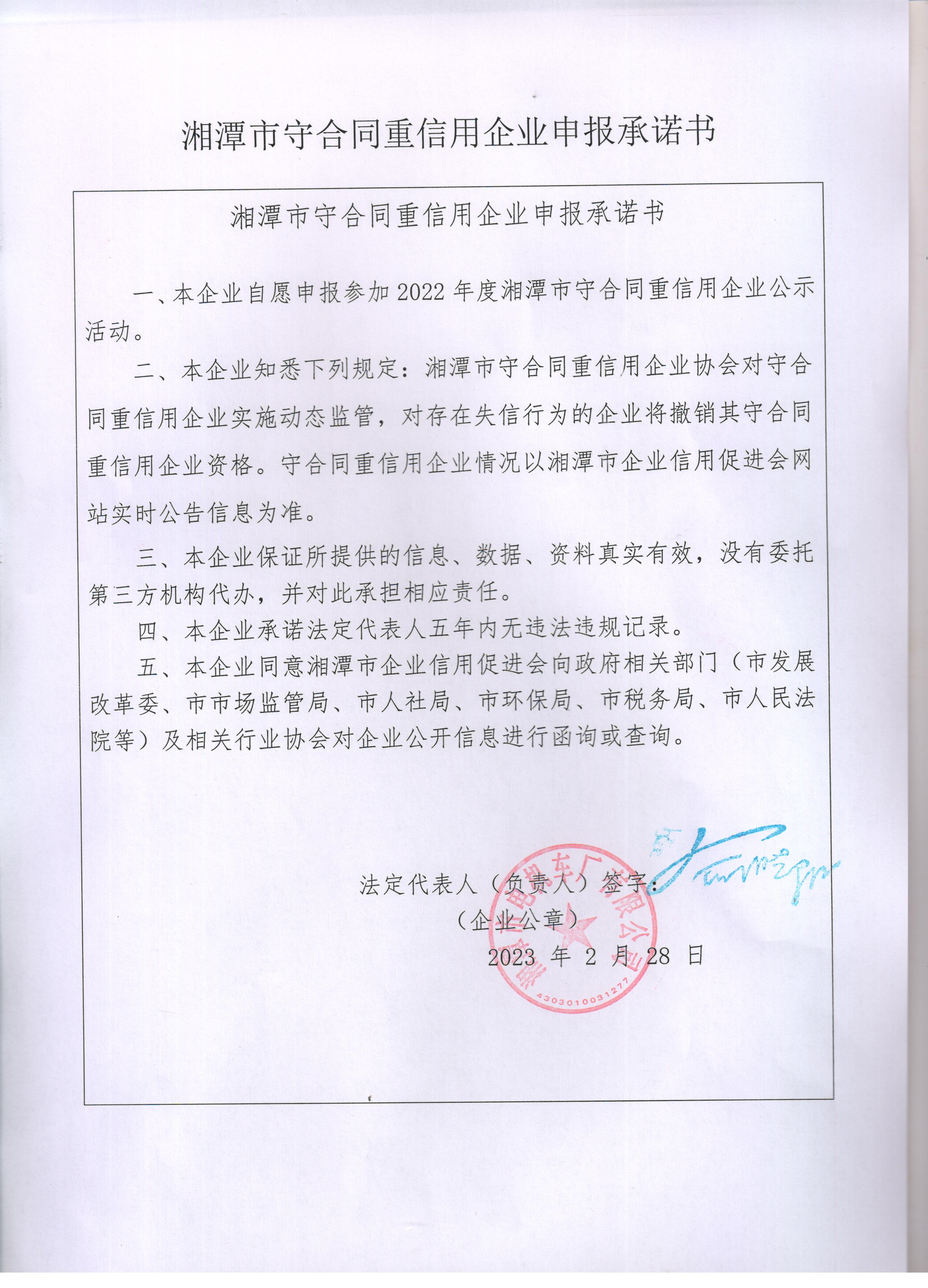 本企業(yè)根據(jù)《湘潭市守合同重信用企業(yè)申報規(guī)定》等編制 2022 年度企業(yè)信用報告書,并保證本報告書內(nèi)容真實、準確、完整。