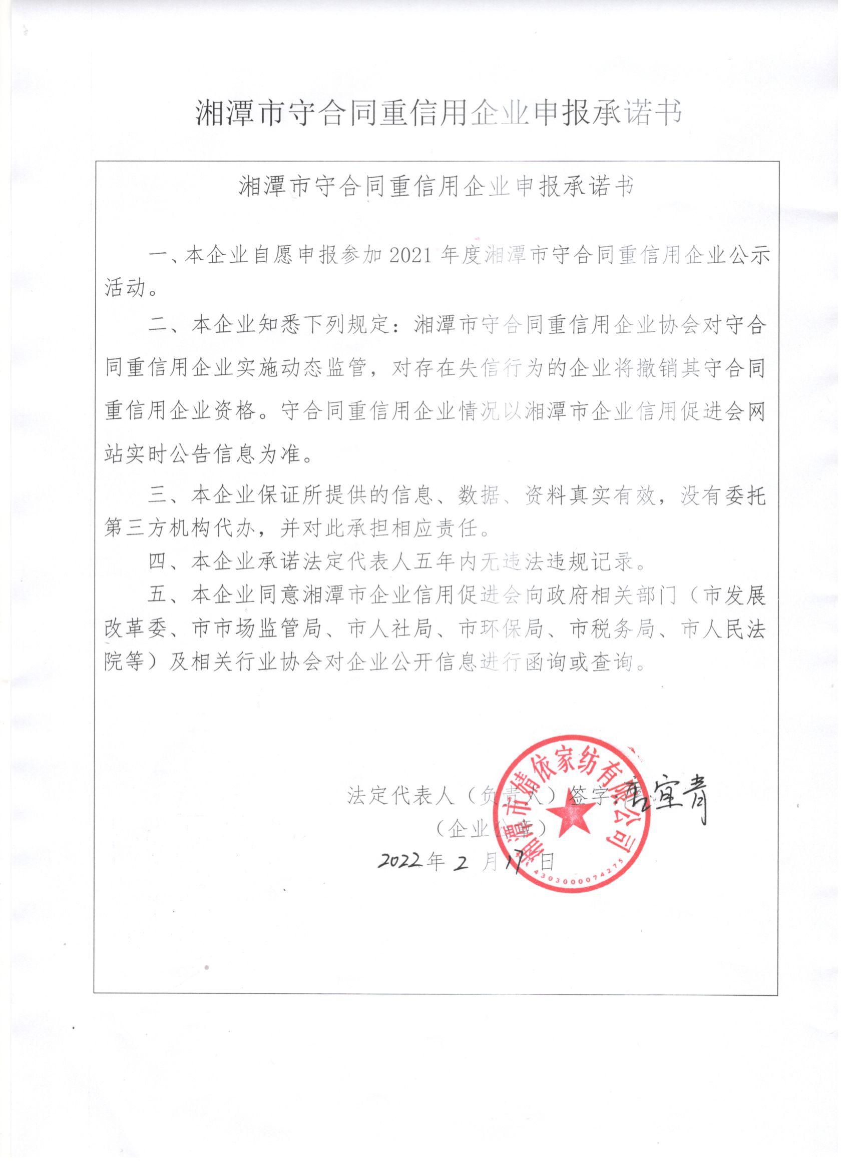 本企業(yè)根據《湘潭市守合同重信用企業(yè)申報規(guī)定》等編制 2021 年度企業(yè)信用報告書,并保證本報告書內容真實、準確、完整。