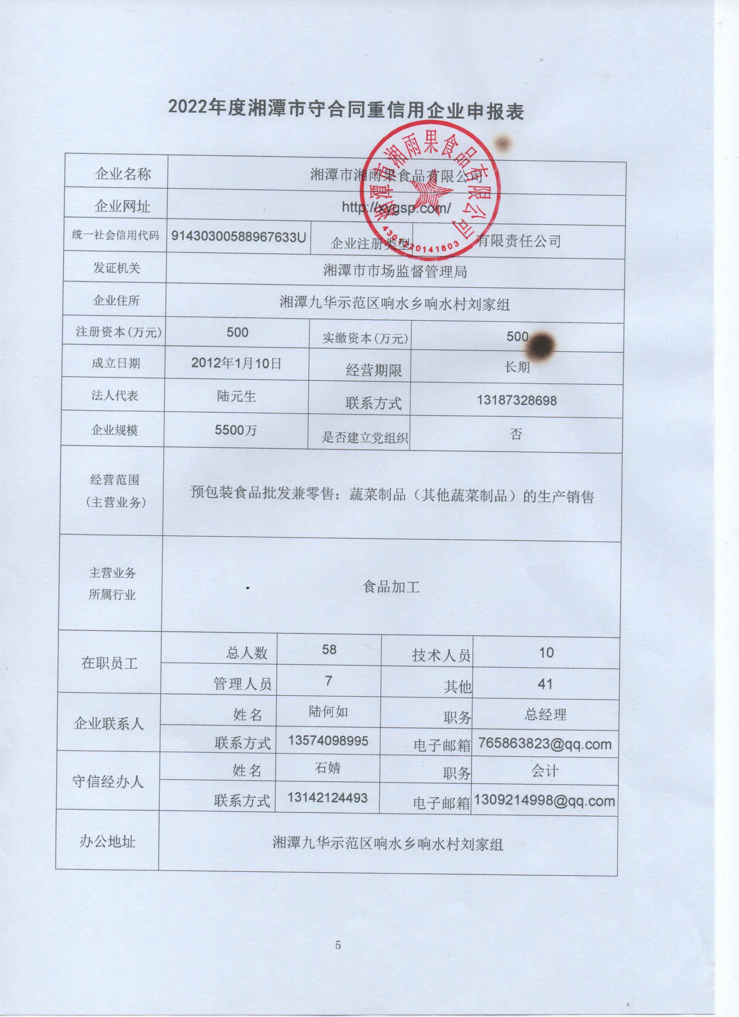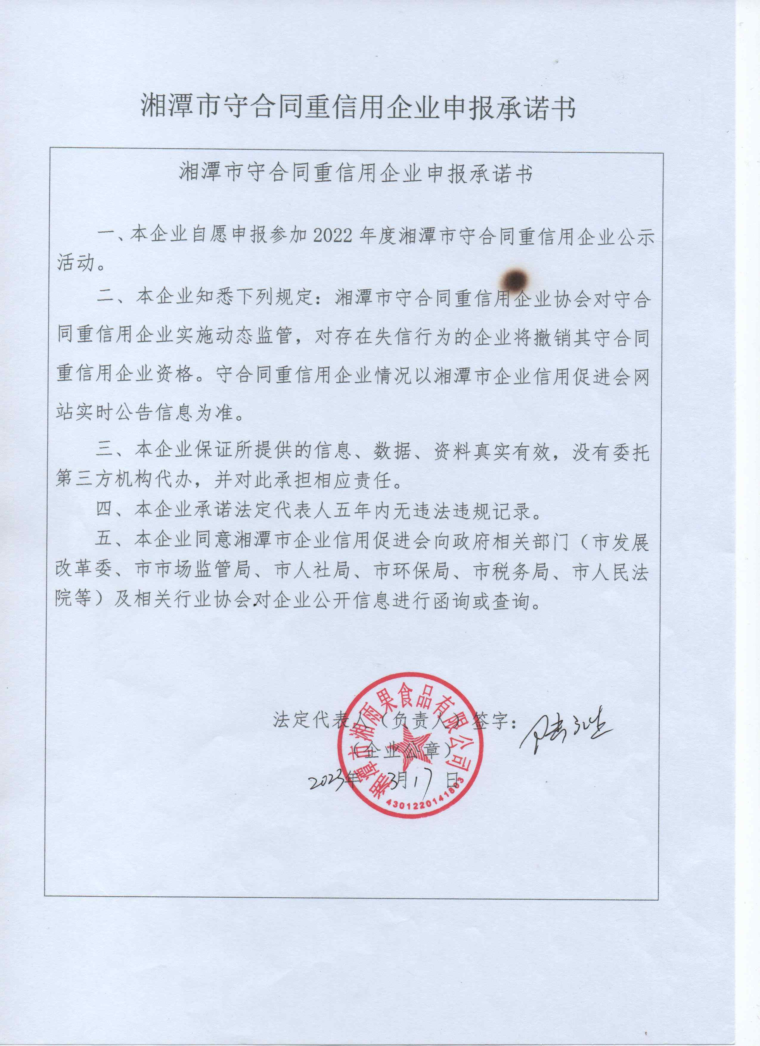 本企業(yè)根據(jù)《湘潭市守合同重信用企業(yè)申報(bào)規(guī)定》等編制 2022 年度企業(yè)信用報(bào)告書,并保證本報(bào)告書內(nèi)容真實(shí)、準(zhǔn)確、完整。